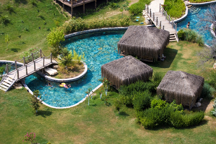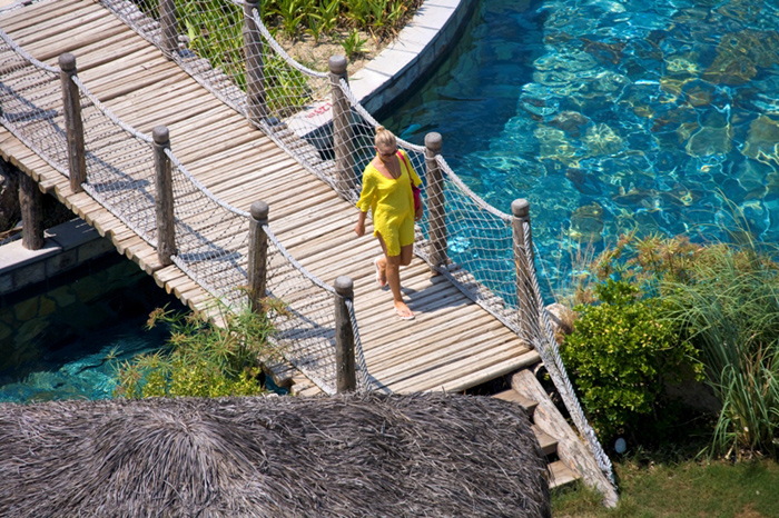 В дизайне использованы натуральные камни, мебель из древесины, окружающие деревья - подчеркнута натуральность этого удивительного места.