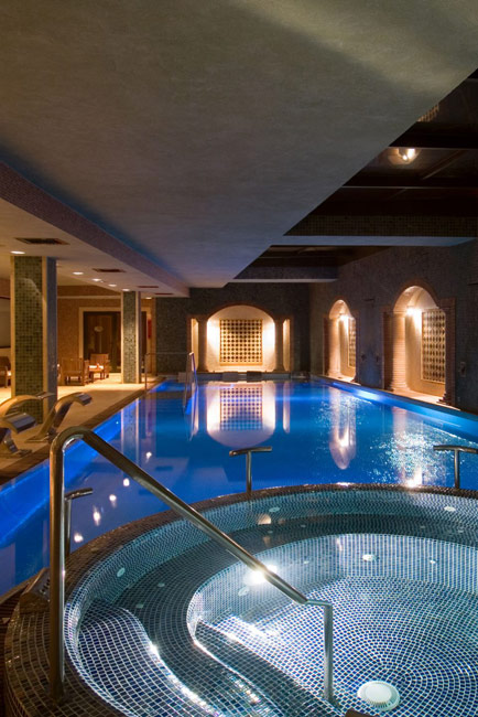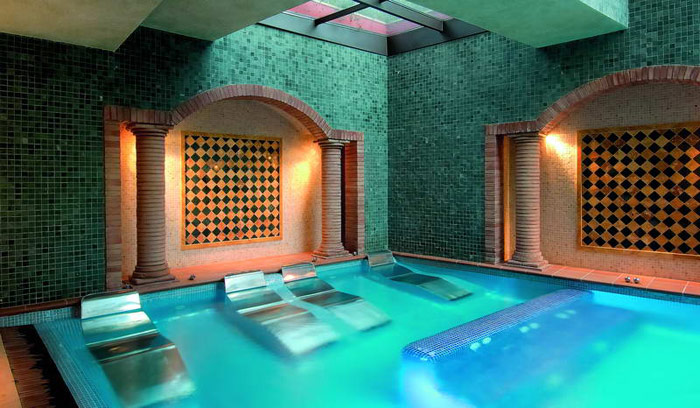 крытый бассейн с климат-контролем, удобными шезлонгами, каскадами, лежаками с подогревом
