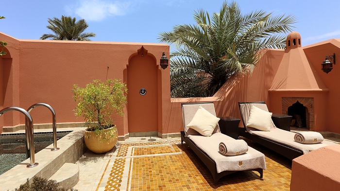 третий этаж – терраса, меблированная диванами и большими подушками, которые скрываются под берберскими пологами из грубой парусины, небольшой камин, обеденная зона и ванная комната (в некоторых коттеджах), персональный бассейн. Панорамный вид на город и заснеженные вершины Высокого Атласа.
