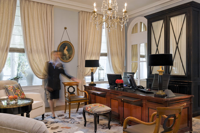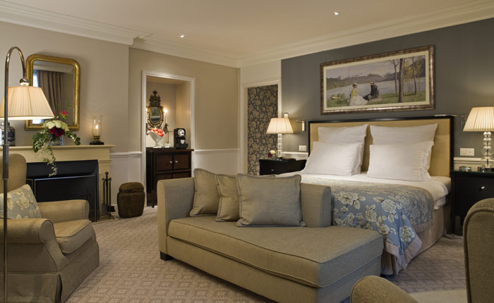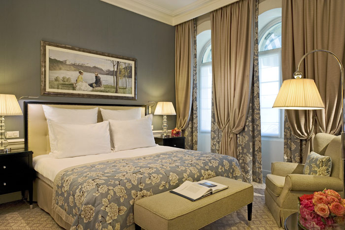 7 Junior Suites (38-48 кв. м) - номер с либо преобладающим светло-голубым тоном, либо с желтым тоном, выполнен во Французском стиле уникального архитектора Пьера-Ив Рошон. Из окон номера категории Жуниор Сьют открывается чудесный вид на Женевское озеро и Альпийские горы. Расположенный на первом, на втором и на третьем этажах, номер этой категории состоит из спальни, ванной комнаты (с душем и ванной, 1 отдельная туалетная комната) и небольшой гостиной. В некоторых номерах так же имеется балкон. В номере есть два рабочих стола с доступом в Интернет. Две отдельные кровати 200 х 210 см. Кроватка для ребенка до 2-х лет. Дополнительная кровать (платно). Максимальное количество взрослых в номере - 2 взрослых и 1 малолетний ребенок (0-1.99 год) или 1 взрослый, 1 ребенок (2- 11.99 год) и 1 малолетний ребенок.