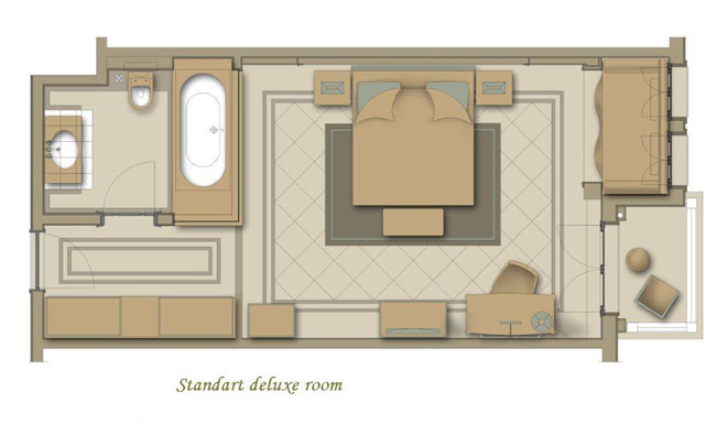 Deluxe Room (30-36 кв. м) – состоит из спальни с двуспальной кроватью или двумя односпальными кроватями, ванной комнаты с джакузи, меблированного балкона. Макс. размещение - 2+1 чел.
