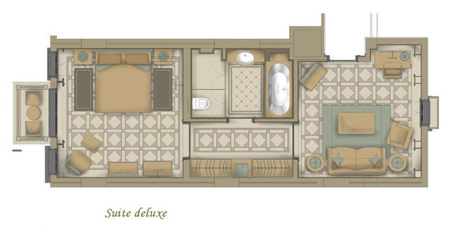 Suite Deluxe (48 кв. м) – состоит из спальни, гостиной, ванной комнаты с джакузи и душем, меблированного балкона. Макс. размещение - 2+1 чел.
