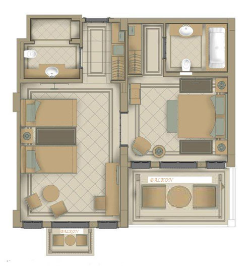 Family Suite (61 кв. м) – состоит из 2-х спален (в одной - двуспальная кровать, в другой - две односпальные кровати), 2-х ванных комнат (одна с джакузи, другая - с душем), меблированного балкона. Макс. размещение - 3+1 чел.