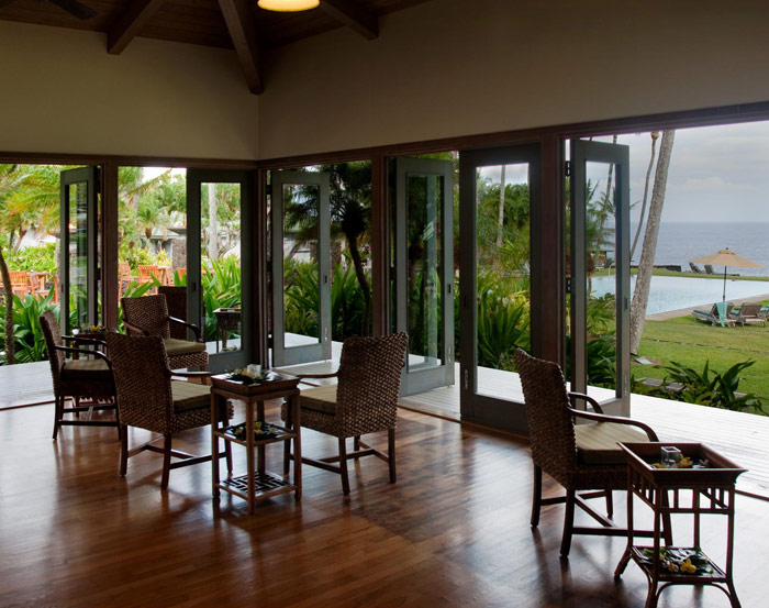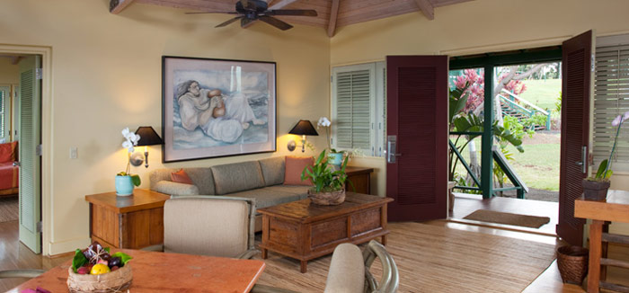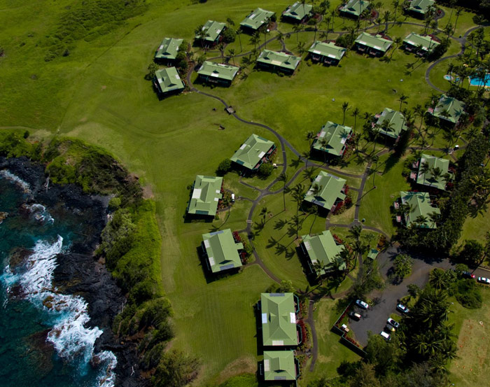 (от 50 кв. м до 87 кв. м). Коттеджи состоят из спальни, просторной ванной комнаты, гостиной с высокими потолками, обеденный стол, бар с алкогольными напитками, террасы с садовой мебелью, в некоторых номерах – джакузи. Коттеджи расположены на скалистом берегу и оформлены в традиционном гавайском стиле, из окон – вид на море.