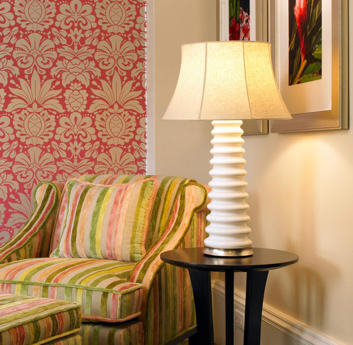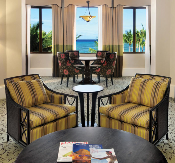 Номера в неоклассическом дизайне обставлены мебелью из темного дерева; из окон/меблированных балконов открываются виды на тропические сады, кокосовую рощу или на бассейн, пляж Waikiki Beach, Тихий океан или вулкан Diamond Head.