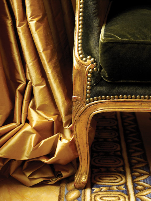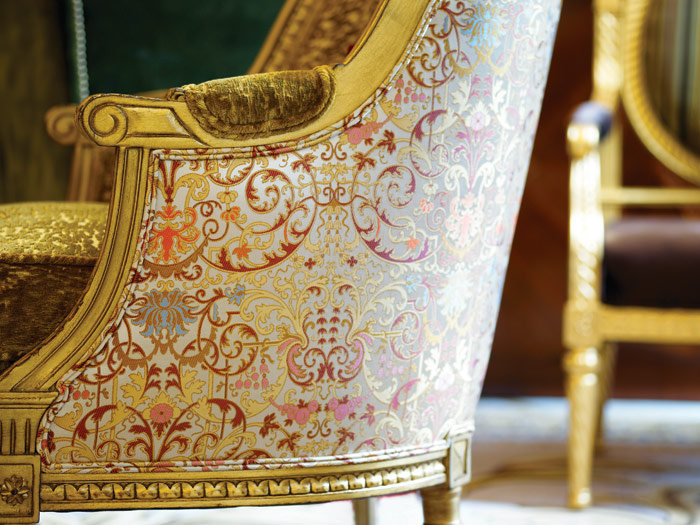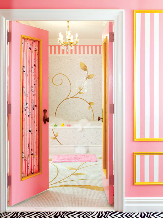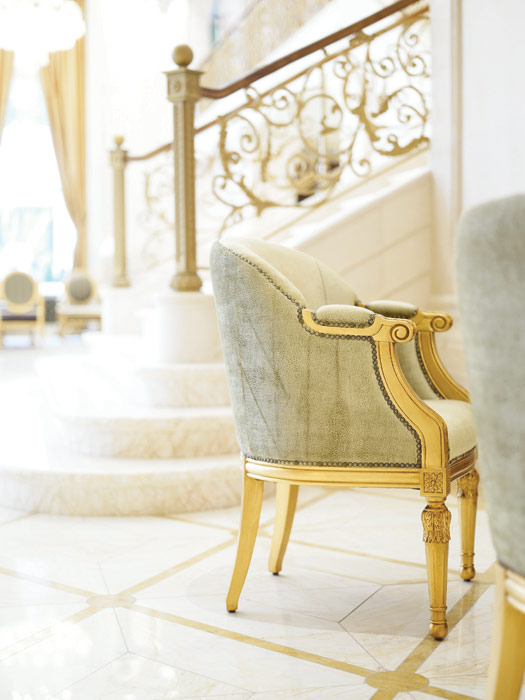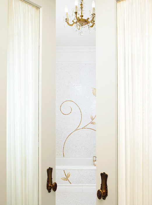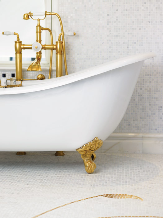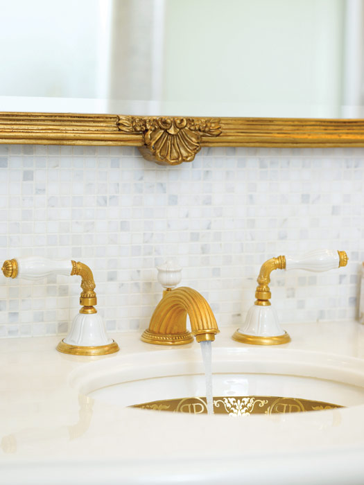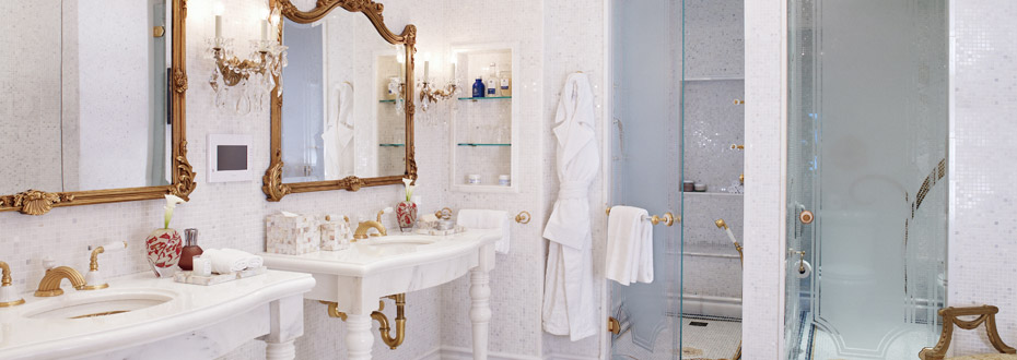 ванная комната с умывальниками фирмы Sherle Wagner, вырезанными вручную из цельного куска белого мрамора и украшенными смесителями, покрытыми 24-каратным золотом; с душевой кабиной и ванной; позолоченные краны и ручки