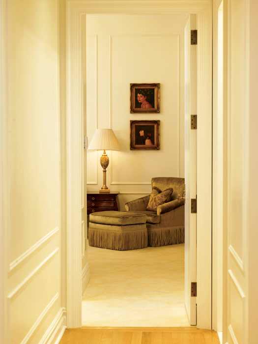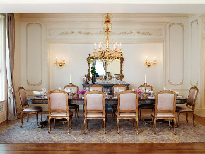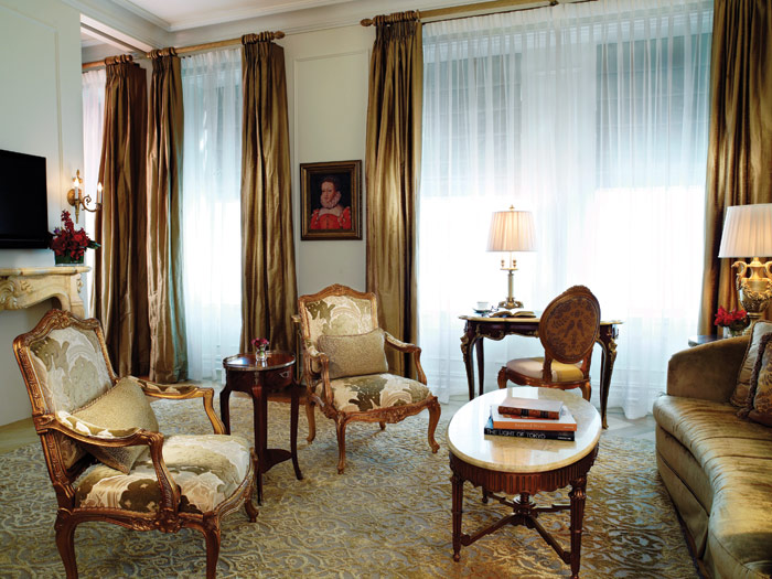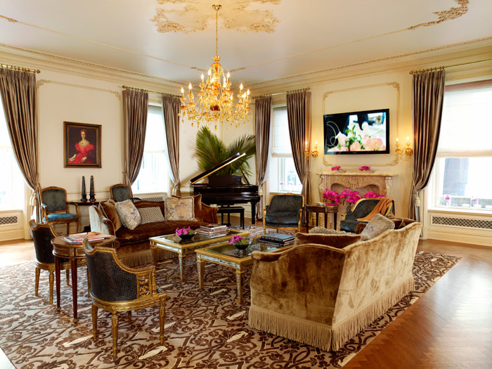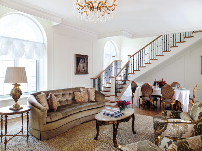 В Suite просторная изысканная гостиная с роялем, зал для обедов и бизнес-встреч на 10 человек, туалетная комната для гостей, кухня, 3 спальни с кроватями King-size, каждая спальня имеет свой отдельный вход и ванную комнату с душевой кабиной и ванной. В номере также имеется комната для занятий фитнесом.