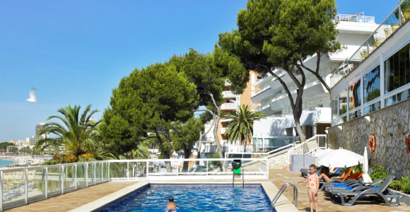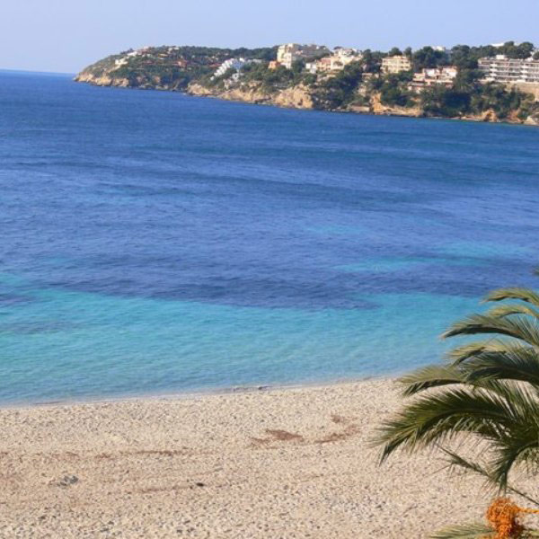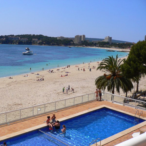 в 25 км от аэропорта, в 20 км от центра г. Пальма, в 200 м от центра туристической зоны Магалуф, на первой линии пляжа.