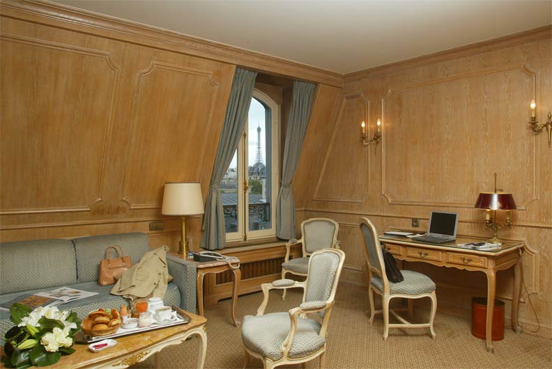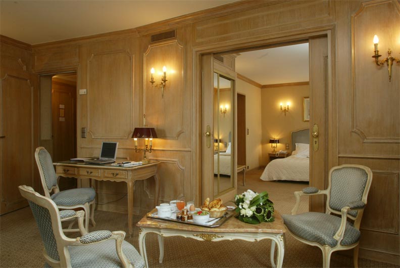 Suite - состоят из двух комнат: спальни и отдельной гостиной. Для наиболее комфортного проживания комнаты звукоизолированны. Благодаря удачной подборке деревянной мебели в сочетании с теплыми пастельными тонами тканей, комната становится более яркой и грациозной, а из окна предстает уникальный вид на Триумфальную арку.
