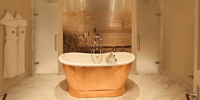 Mansion Deluxe Room (37 кв. м) – состоит из спальни с кроватью king-size, зоны отдыха, ванной комнаты с медной ванной, отдельной душевой кабиной и теплыми полами. Особенность ванной комнаты - большие окна с видом сельской местности. Вид на лес.
