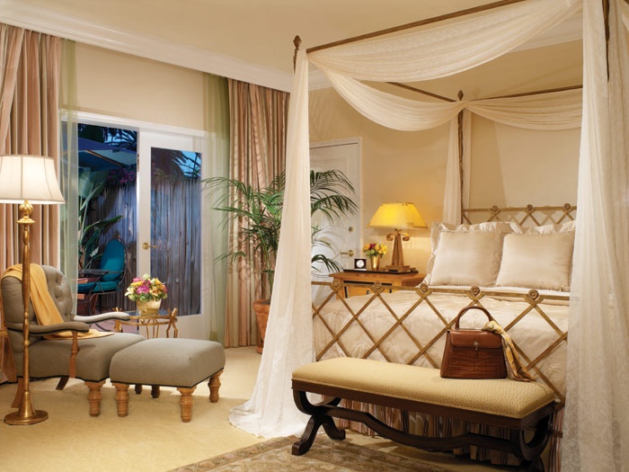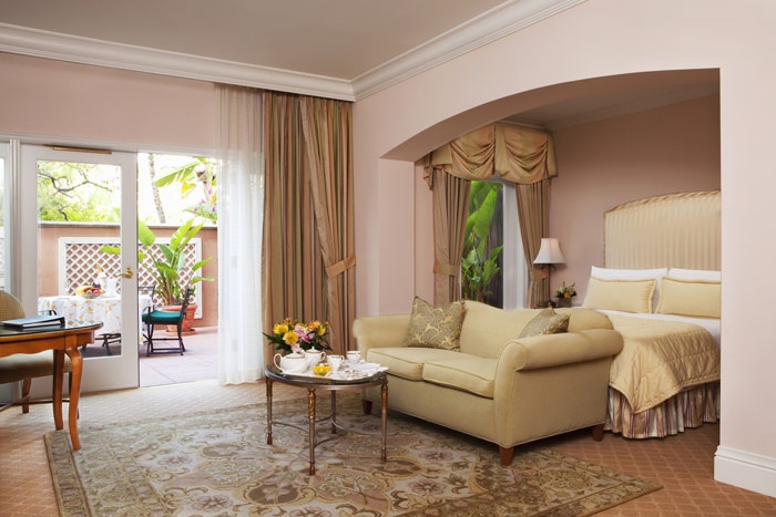 Beverly Hills Suite with Patio (74 кв. м) — с видом на северную или южную стороны; состоят из спальни c кроватью king-size, просторной гостиной с рабочим столом и камином, полутора мраморных ванных комнат с джакузи и просторного внутреннего дворика. Меблировку в классическом стиле дополняет декор, оформленный в мягких желто-оранжевых, желтых, розовато-лиловых и бежевых тонах.
