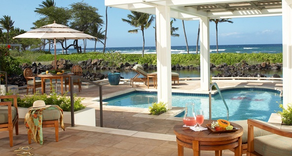 Ocean View Bungalow (371,6 кв. м) - с видом на тихий океан и закаты Kohala Coast. Включает две спальни (31, 5 кв. м каждая, одна – с кроватью king-size, другая – с двумя кроватями twin), две с половиной ванны (2 – с джакузи и паровой душевой кабиной), большую гостиную (85 кв. м) и столовую, кухню, просторную террасу с бассейном, джакузи, обеденной зоной, зоной для отдыха и площадкой для барбекю. Рядом с террасой расположен живописный пруд с рыбой. Дополнительно в номере – CD/DVD player, компьютер, факс, плазменный телевизор с диагональю 50.