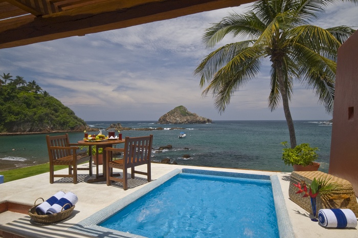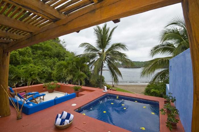 3 Casitas - две спальни с кроватями king-size, столовая, небольшая кухня, терраса с видом на Тихий океан. Есть бассейн с шезлонгами.