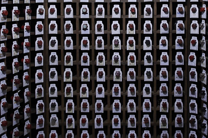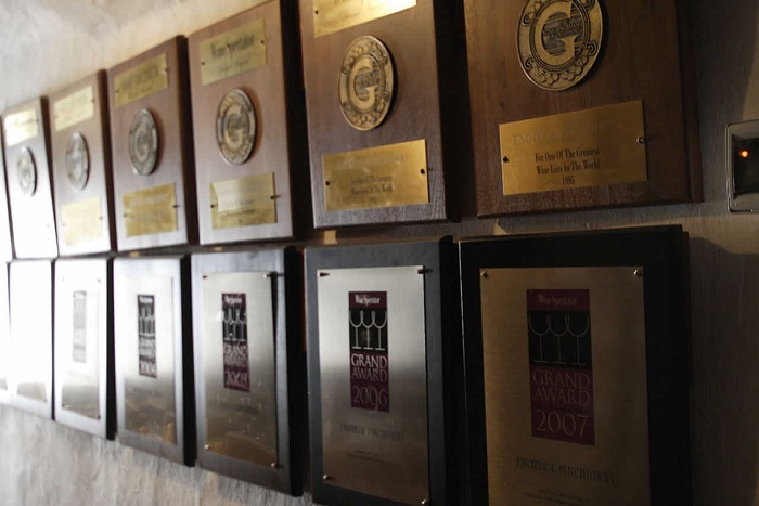 Винный погреб Enoteca Pinchiorri можно считать легендарным. В 2010 году он был объявлен одним из лучших в стране. Джорджио собрал лучшие сорта — сначала во Флоренции, потом по всей Италии. К тому же он много путешествовал и пополнял винную коллекцию. Сегодня она составляет более 200 сортов вина. В подвалах хранятся эксклюзивные марки. Особая гордость Enoteca Pinchiorri — уникальное вино Romanee Conti 1985 года (емкость 6 литров, порядковый номер 000 001). Цена Romanee Conti — 300 000 евро. Коллекция интересна не только количеством собранных экземпляров (около 100 000), но и тем, что все бутылки имеют лейбл и особенное расположение. Также в погребе хороший выбор винтажных коньяков, виски и рома. Гостям предлагается две винные карты: итальянская и международная.
