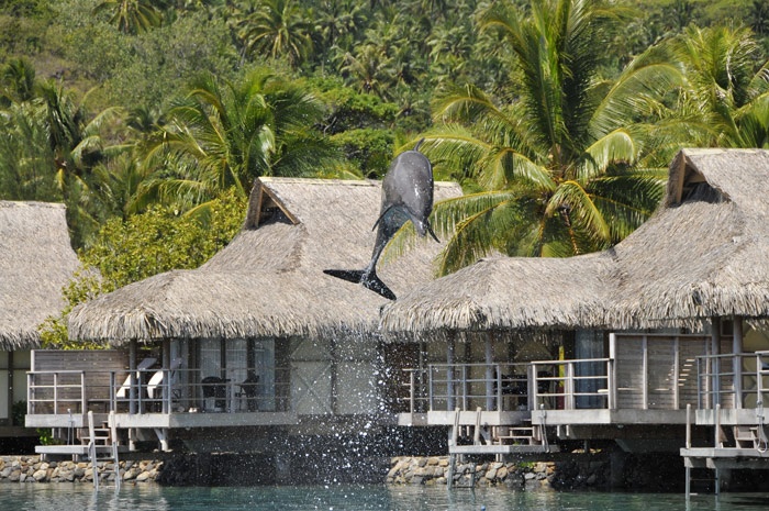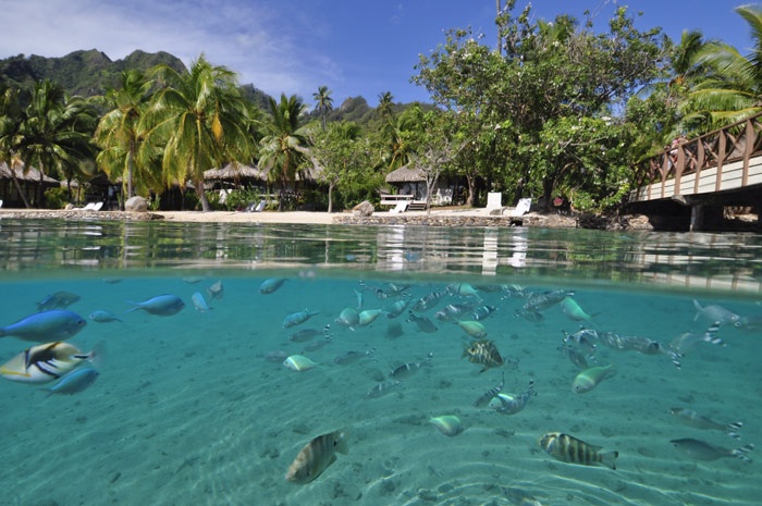 на берегу прозрачной лагуны, в которой резвятся дельфины, на побережье острова Moorea, в 27 км от международного аэропорта.