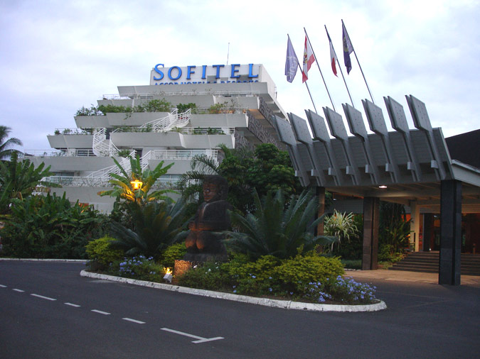 Отель Sofitel Tahiti Maeva Beach Resort, построенный на берегу прекрасной лагуны, имеет современную архитектуру и напоминает формой круизный корабль (здание отеля возвышается на 7 этажей).