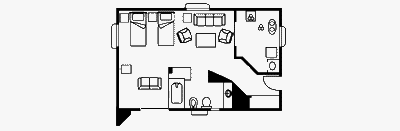 Удобная гостиная / спальня с двумя кроватями, софа, кресла, кофейный столик, телевизор с фильмами по запросу, соединение с интернет и письменный стол
