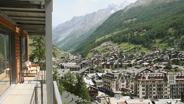 на 45-метровой скале, в центре Церматта, в 4 часах езды от международного аэропорта Цюриха, в 1,5 часах езды от аэропорта Сьона и в 5 км от ж/д станции Tasch.