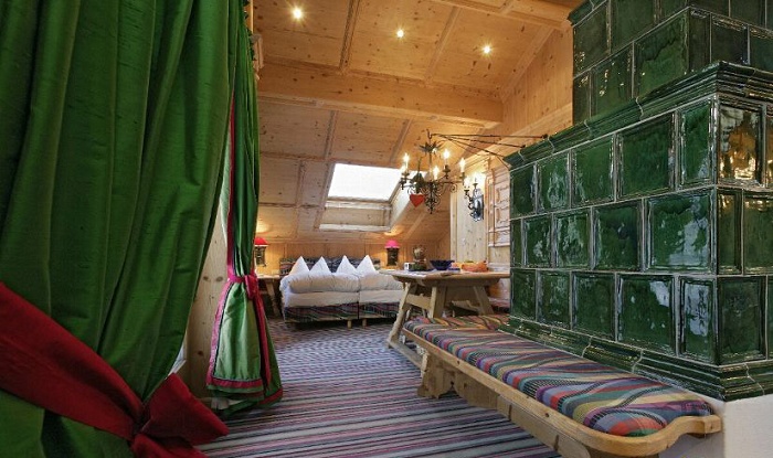 Luxury Suite – South (44 кв. м) – перегородка разделяет номер на 2 части: спальню и гостиную с изразцовой печью. Ванная комната с джакузи и отдельный туалет. Вид на Маттерхорн.