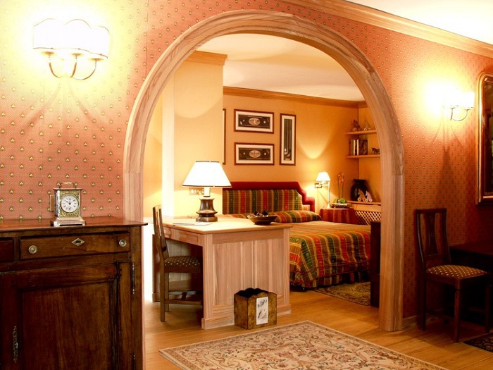 Все номера имеют интерьеры в традиционном альпийском стиле, выдержанные в теплых тонах, с потолками, обшитыми деревянными балками, красивыми драпированными шторами, удобной мебелью, изысканной живописью на стенах.