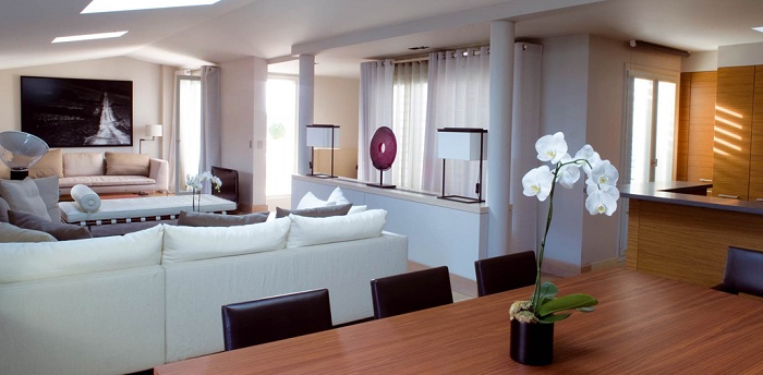 Apartment 6 (160 кв. м) - расположен на 2 этаже, включает: гостиную, офис с мультимедийным оборудованием, системой Wi-Fi и принтером, столовую (50 кв.м.), оборудованную кухню Varenna, выходящую в столовую и гостиную, 2 спальни, 2 ванные комнаты, дополнительную туалетную комнату.