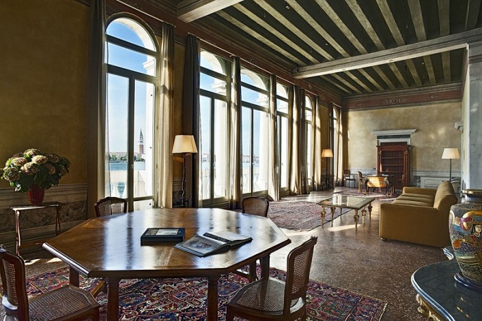 Residenza F* (Апартаменты F - 300 кв.м.) - апартаменты с 2 семейными спальнями и 2 персональными ванными, большие шкафы, туалет для гостей, гостиная с 8 большими окнами, выходящими на север на лагуну Сан-Марко, и 8 окнами, выходящими на юг в сад, захватывающая панорама, дизайнерская оборудованная кухня с винным шкафом и кладовой. Северная сторона.