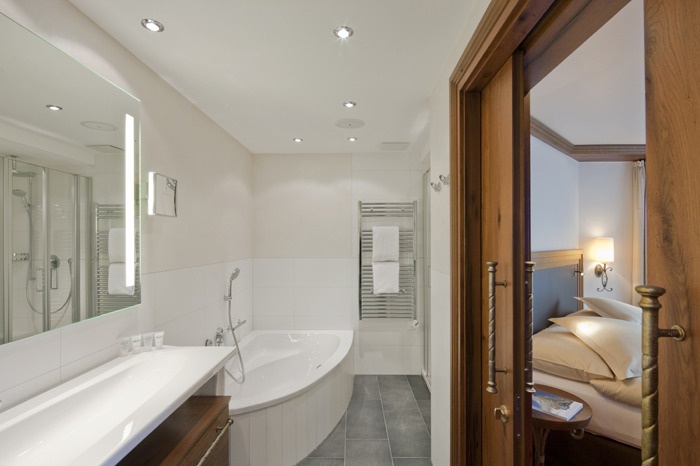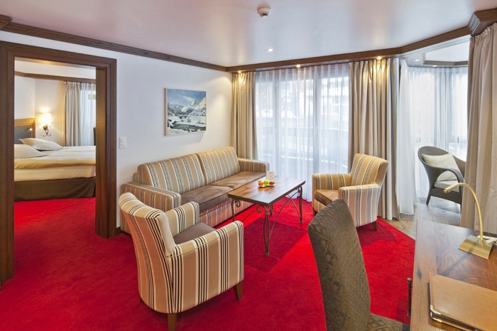 Suite without View to the Matterhorn (48 кв.м.) - роскошно обставленные номера состоят из спальни с большой ванной комнатой с душем и отдельным душем, гостиной с диваном-кроватью, спальня и гостиная разделены раздвижной дверью, система B&O.