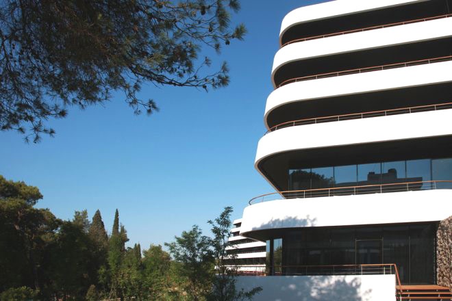 Отель Lone окружен лесом и похож на роскошный корабль, который гармонично сочетается с окружающей средой. Отель полностью отличается от других отелей своим современным дизайном и возможностью организации деловых встреч и конференций, обладает одним из самых больших и современных конференц-залов на всем Адриатическом побережье Хорватии, вместимостью до 600 человек.