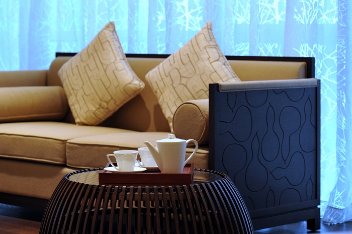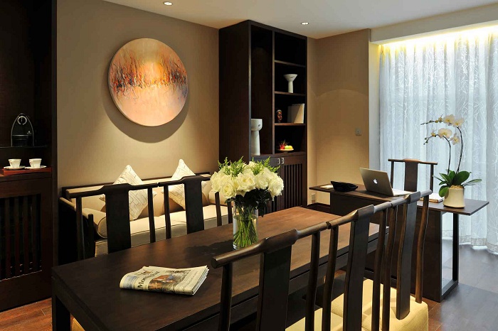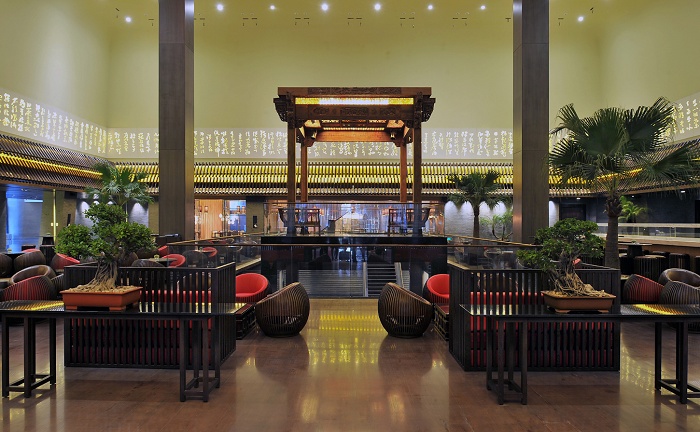 Элегантные номера, оборудованные всевозможными техническими новинками, выдержаны в теплых пастельных тонах и обставлены великолепной авторской мебелью из темного дерева, стены украшены картинами, выполненными в характерном для современного Китая стиле.