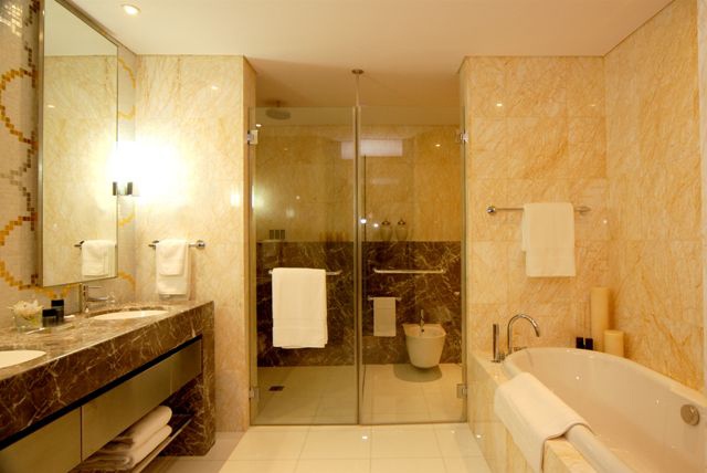 роскошная ванная комната полуоткрытого типа с ванной и отдельной душевой кабиной