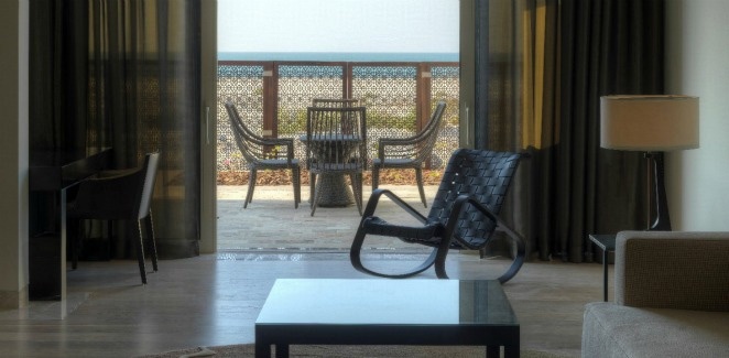 Сьюты и виллы предоставляют идеальные возможности для уединенного отдыха. К каждому номеру примыкает просторная терраса с видом на Персидский залив, гольф-клуб или бассейны курорта. Виллы и сьюты категории Beach View и Garden View также располагают собственным бассейном. В декоре спален и прихожих использовано сочетание дуба и черного американского ореха, а ванные комнаты отделаны китайским темным и оманским белым мрамором.