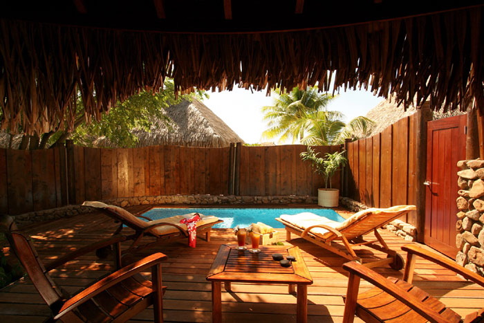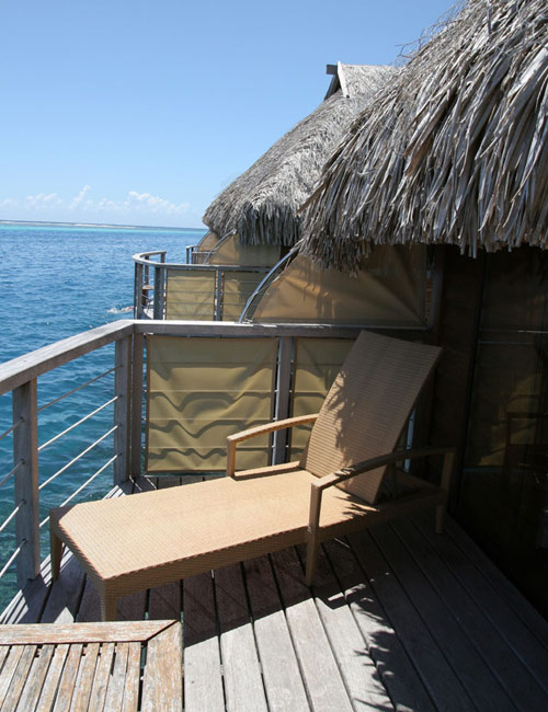 8 Overwater Bungalows (48 кв.м) - бунгало расположены на сваях в водах лагуны, ближе к берегу и горам (глубина воды 1,2 метра). Бунгало состоит из спальни (кровать King и софа), ванной комнаты с ванной, большой меблированной террасы со спуском в лагуну. Максимальное размещение 3 взрослых и 1 ребенок.