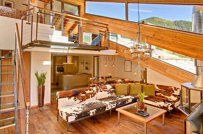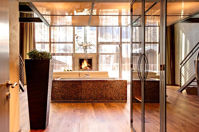 Loft Suite (55-65 кв. м) - расположен на верхних этажах, двухуровневый номер с панорамными окнами высотой 4,4 м, выходит на восточную сторону и включает: на первом этаже – гостиная с диваном, камином и открытой ванной, обеденная зона, туалетная комната, на втором этаже-галерее – спальня открытого плана, ванная комната с душем. С балкона или террасы открывается чудесный вид на вершину Маттерхорн. Максимальное размещение - 2-4 человека.