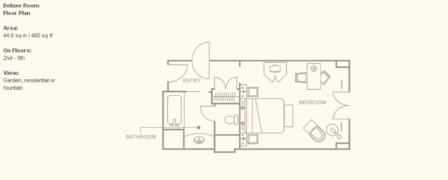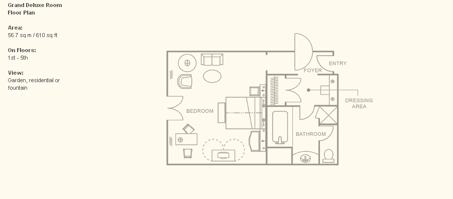 Grand Deluxe Room (57 кв. м) - расположены в главном здании; состоят из спальни (кровать king-size), мини-гостиной и ванной комнаты с ванной и душевой. Все номера этой категории были отремонтированы в сентябре 2000 года.