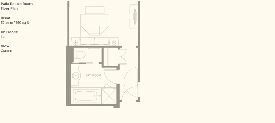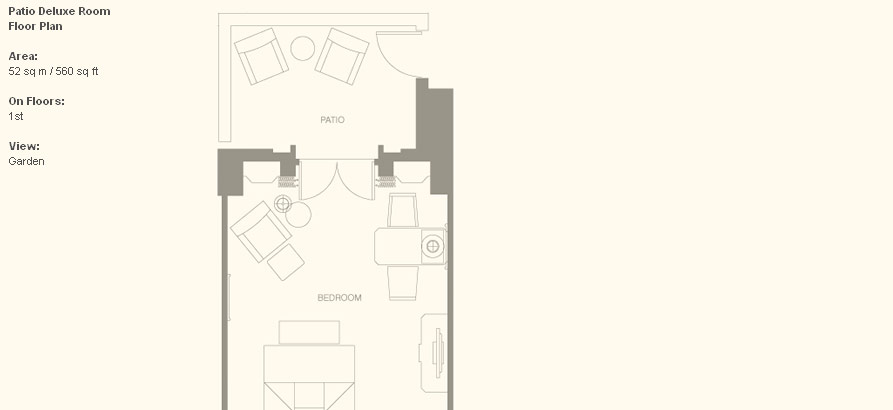 Patio Deluxe Room (45 кв. м) - спальня с кроватью king-size или двумя отдельными кроватями, ванная комната с ванной и душем. Расположены в главном здании. С видом на сад или собственный внутренний дворик (7,5 кв. м).