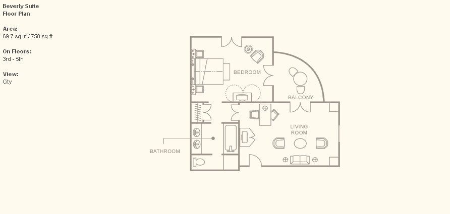 Beverly Suite (70 кв. м) - с видом на фонтан отеля. Состоит из спальни, отдельной гостиной, ванной комнаты с ванной и душем. Есть балкон.