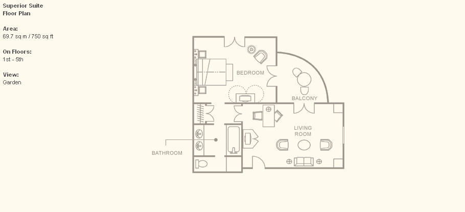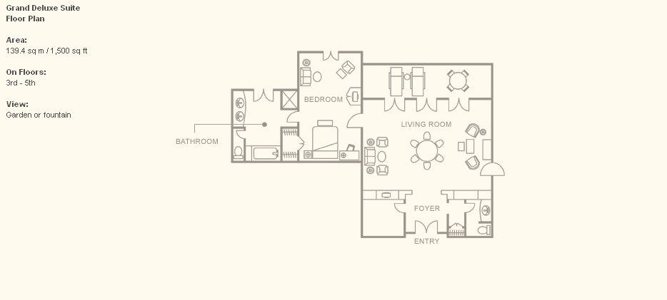 Grand Deluxe Suite (140 кв. м) - состоит из спальни, гостиной, ванной комнаты с ванной и душевой и балкона. Возможно совмещение с номерами других категорий.