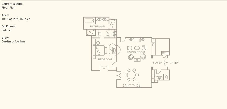 California Suite (107 кв. м) - состоит из спальни, гостиной с обеденным столом на 6 персон, гостевой уборной и ванной комнаты с ванной и душевой. Полы из твердой древесины способствуют созданию "калифорнийской темы" этого номера.