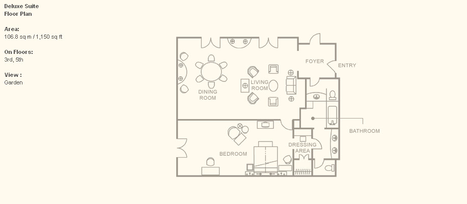 Deluxe Suite (107 кв. м) - состоят из спальни, гостиной с обеденным столом на 6 персон, гостевой уборной и ванной комнаты с ванной и душевой. Возможно совмещение с номерами других категорий.
