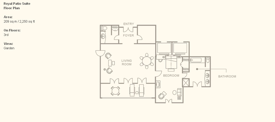 Royal Patio Suite (209 кв. м) - с видом на сады; состоит из спальни, гостиной, столовой, полностью оборудованной кухни, гостевой уборной, ванной комнаты с ванной и душевой и внутреннего дворика. Возможно совмещение с номерами других категорий.