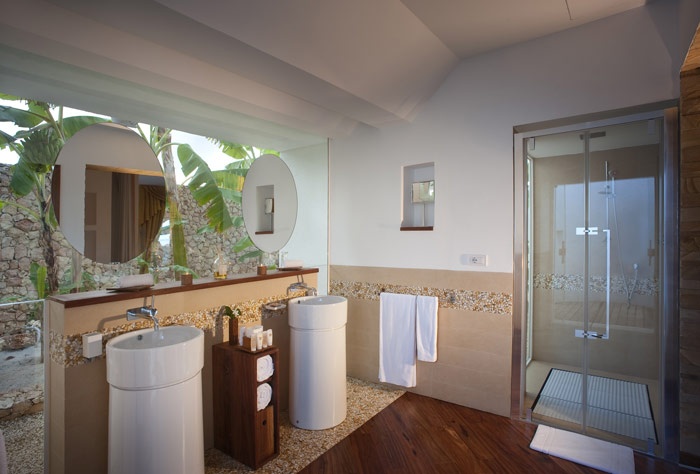 ванная комната с двумя душевыми кабинами (внутренней и наружней), 2 раковинами