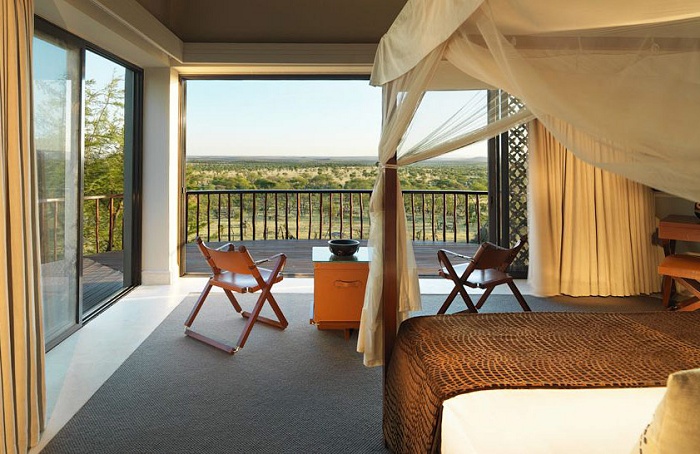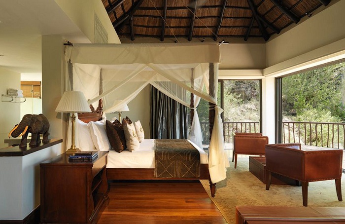 Savannah Room (50 кв.м.) - номер состоит из спальни с кроватью king size или двумя односпальными кроватями, гардеробной, ванной комнаты с "ливневым" душем и окном, выходящим на саванну, и просторной меблированной террасы с видом на африканский заповедник.