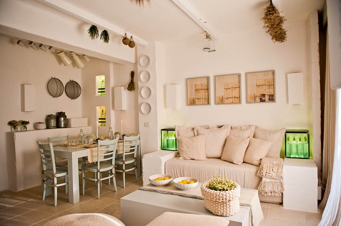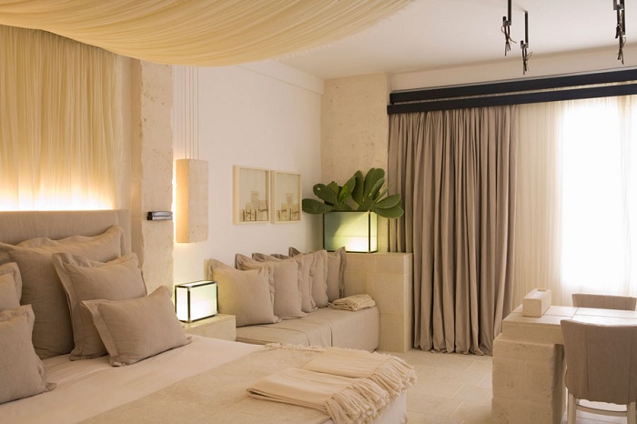 Suite Egnathia (125 кв. м) – состоит из спальни с кроватью king-size, гостиной с камином, гардеробной, ванной комнаты с ванной в центре, дополнительной ванной комнаты, сада с собственным бассейном, террасы с видом на море и холмы. Возможно объединение с Superior Room.
