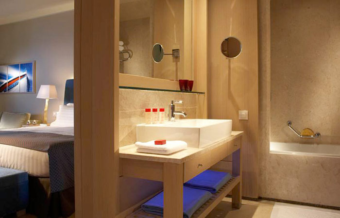 Deluxe Room Sea View (42 кв. м) - спальня с гостиной зоной (кровать king-size, доп. - софа), ванная комната с ванной и душевой кабиной, балкон. Номера имеют открытую планировку. Вид на море. Макс. 3 чел.