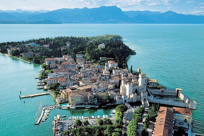 в центре города Сирмионе, на берегу озера Гарда, в 45 км от Вероны, в 179 км от международного аэропорта Милана.