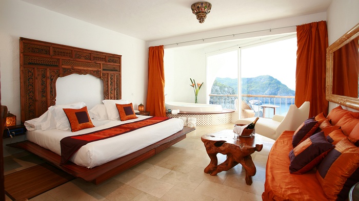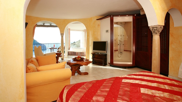 Eden Room - состоит из спальни с двуспальной кроватью или двумя отдельными кроватями, дивана-кровати и джакузи рядом с панорамным окном, террасы с садом и бассейном. Вид на море.