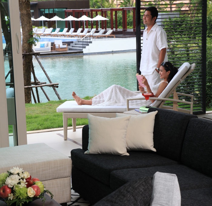 Каждая из вилл имеет 2 уровня — с гостиной, столовой зоной и кухней на нижнем уровне. Дизайн выдержан в современном тайском стиле; из панорамных окон, меблированных балконов/павильонов открытой формы Salas открываются виды на частные тропические сады и на лагуну. Для гостей — услуги дворецкого.