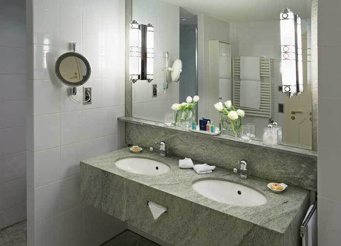 ванная комната, отделанная мрамором (большинство номеров с отдельностоящими душевыми кабинами)