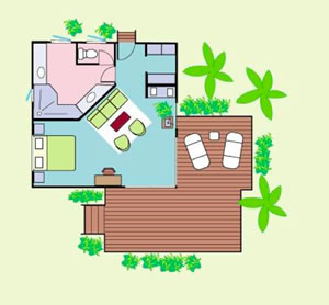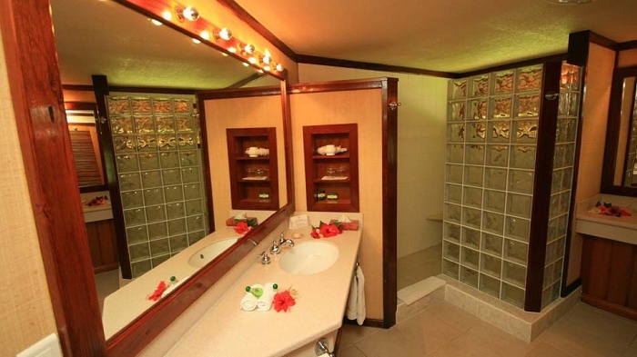 5 Beach Bungalows (93 кв. м, включая террасу) - состоит из спальни с кроватью king-size или 2-мя двойными кроватями, гостиной зоны со стульями, мраморным журнальным столиком, диваном из ротанговой пальмы и письменным столом, роскошной ванной комнаты с двумя раковинами, отдельного туалета, террасы. Расположены на пляже под тенью пальм.