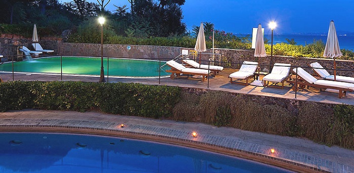 на острове Искья, рядом с портом города Искья, на пляже залива Пунта Молино, в сосновой роще, напротив Арагонского замка, в 45 мин. езды от международного аэропорта Неаполя.